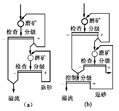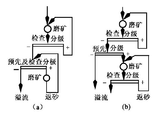 為了得到較細(xì)的磨礦產(chǎn)物以及需要進(jìn)行階段選別時,經(jīng)常采用兩段磨礦流程。進(jìn)行階段選別時,第一磨礦段的產(chǎn)物進(jìn)入第一段選別,選得精礦,其尾礦或中礦(有時可能是混合精礦或粗精礦)經(jīng)第二段磨礦后,再進(jìn)入第二段選別。