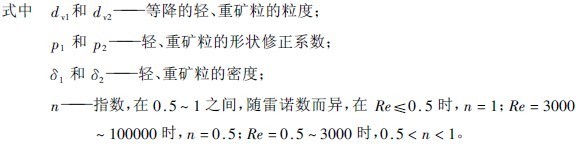 小密度顆粒的粒度與沉降末速度相等的大密度顆粒粒度之比值,稱為顆粒的等降比,其值大于1。可以根據(jù)沉降速度相等的關(guān)系求出。