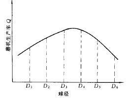 實(shí)驗(yàn)室磨機(jī)的規(guī)格小,相應(yīng)的給礦粒度也小,試驗(yàn)結(jié)果可作為中細(xì)磨機(jī)的球徑選擇依據(jù)。因?yàn)榻o礦粒度小,通常3~5mm以下,給礦粒度范圍窄,因此采用單種球徑球組進(jìn)行試驗(yàn)即可。選擇的球組不應(yīng)低于3組,較好的是5或6組,目的是要將待求更好的球徑包括在內(nèi),不漏掉較佳值。當(dāng)其它參數(shù)固定不變時(shí)磨機(jī)指定級(jí)別在生產(chǎn)率與球徑之間的關(guān)系是一個(gè)單峰函數(shù),如圖3-5-2所示。如果選擇D1、D2、D3三種球,生產(chǎn)率曲線到D3時(shí)呈上升趨勢(shì),無(wú)法判定D3,是較好的球徑值;同樣,選擇D4、D5、D6三種球時(shí),也無(wú)法判定D4是較好的球徑值,只有使生產(chǎn)率曲線達(dá)到峰值和導(dǎo)數(shù)轉(zhuǎn)向時(shí)才能找出更好的值。