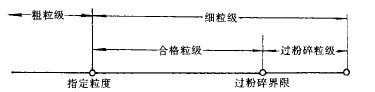 試驗(yàn)方法中的一個(gè)重要問(wèn)題在于,如何判定磨礦效果的好壞。就以生產(chǎn)率而論,達(dá)不到指定級(jí)別(如0.074mm或其它粒度)的稱(chēng)為“粗級(jí)別”,達(dá)到指定級(jí)別及以下的稱(chēng)為“細(xì)級(jí)別”,而細(xì)級(jí)別中又包含“過(guò)粉碎”級(jí)別,幾者之間的關(guān)系可表示在圖3-5-2中。