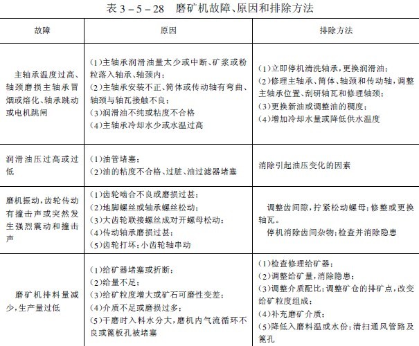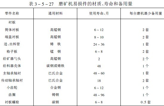 我國選礦廠生產(chǎn)實踐中球磨機易損件的材質(zhì)、使用壽命和設備用量列入表3-5-27中。常見故障、原因和排除方法見表3-5-28。