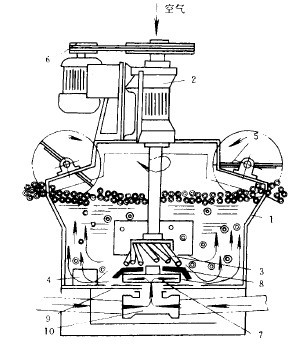 每個浮選槽均由槽體1、軸承體(連同中空主軸)2、斜棒葉輪3、穩(wěn)流器4、刮板5、傳動裝置6及凸臺等組成。吸入槽中,除有上述部件(凸臺由壓蓋代替)之外,在其中空主軸的下端還有提升葉輪7、壓蓋8和底盤9(見圖1)。浮選槽只起浮選作用。吸入槽除起浮選作用外,還兼有吸漿能力,即把槽外的礦漿通過提升葉輪的作用并經(jīng)導(dǎo)管10吸入槽內(nèi)。穩(wěn)流器是由幾十條垂直放置的曲率不同的圓弧板所組成。凸臺(及壓蓋)是用穩(wěn)流器的圓弧形邊緣壓在槽體底部的。
